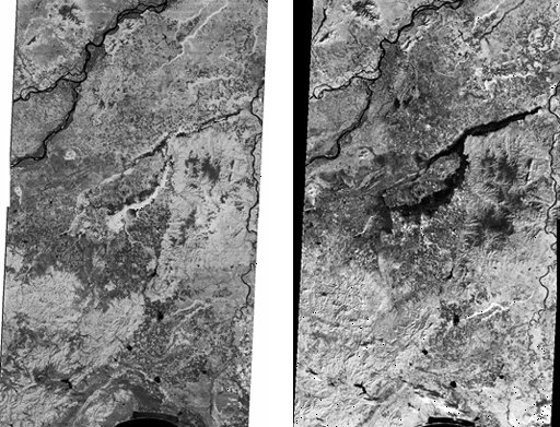 ▼ 右の画像はTMのチャンネル5(短波長赤外)の画像で、画像の濃淡は地表面の乾湿におおむね対応しています。
